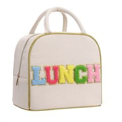 Présentoir de 12 sacs isothermes en toile polyester "canvas" avec LUNCH en lettres style "patch", passepoil doré, contour des lettres dorés.