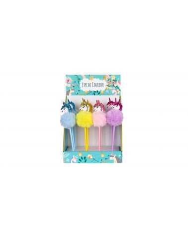 Retrouvez notre ensemble de 24 stylos de couleurs de  la collection fourrure licorne. Ces stylos fantaisies sont vendus dans quatre modèles de couleurs différentes : bleu, jaune, rose et mauve. Chacun des stylos licorne à paillettes est composé d'une fourrure sur l'extrémité avec une tête de licorne, toutes deux de la même couleur que le stylo. Ces stylos licorne à fourrure pour enfants se glissent facilement dans les trousses et sont idéaux pour écrire les idées créatives.